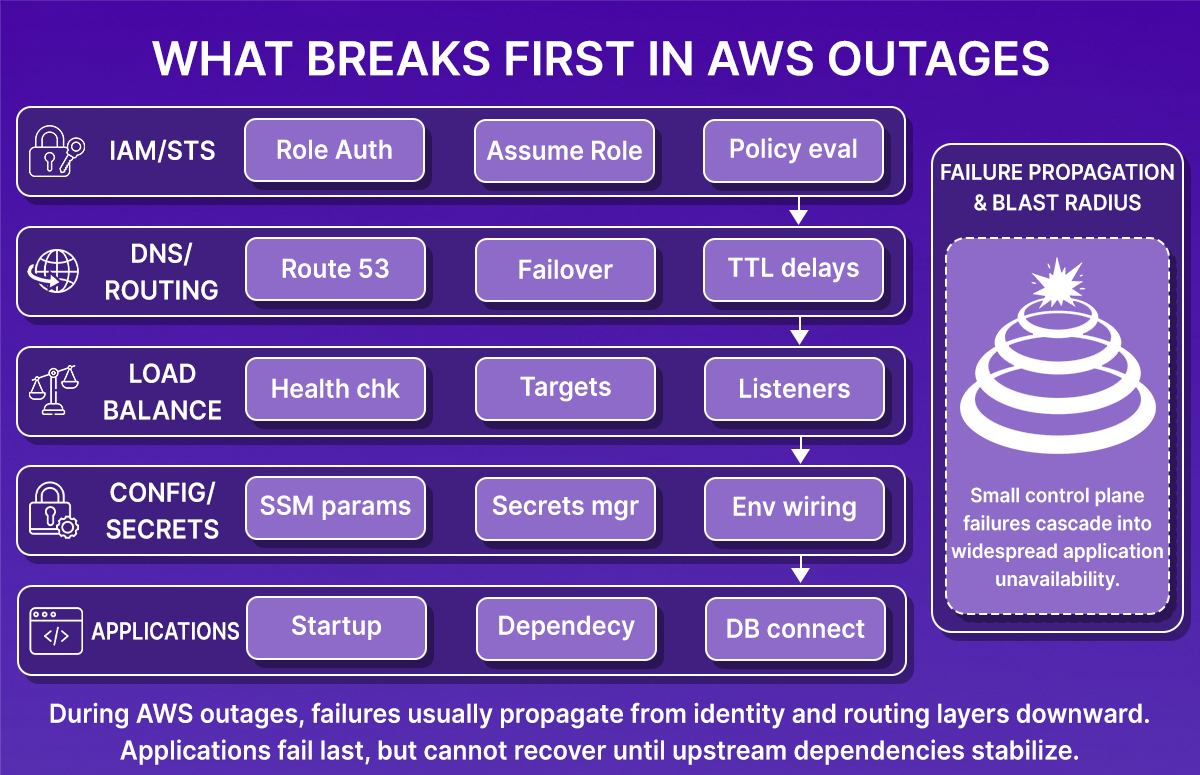 - AWS outages usually don’t destroy data; they disrupt the infrastructure on which applications depend, including networking, IAM, load balancers, and service coordination.