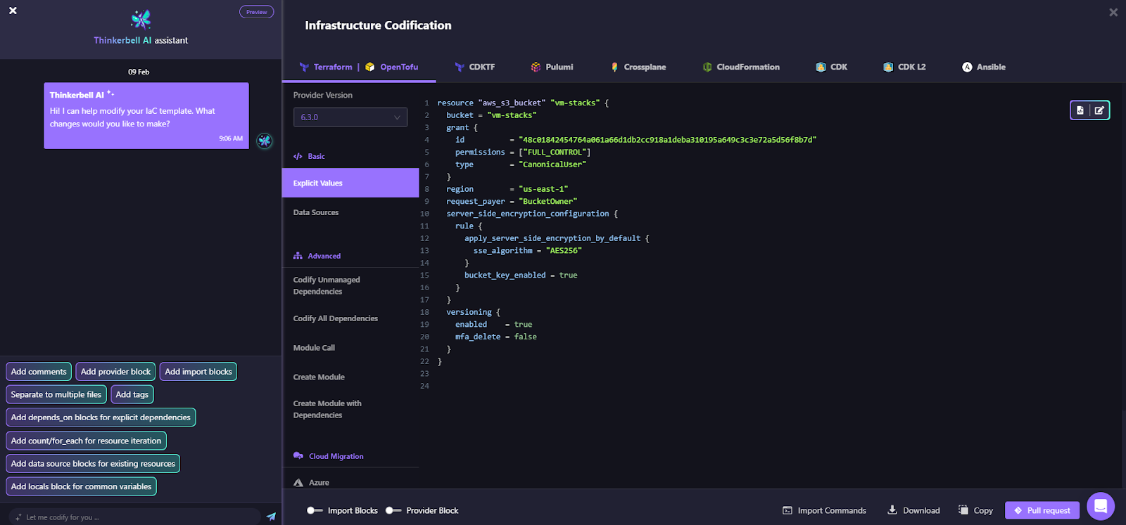 Here, an unmanaged S3 bucket named vm-stacks is defined, and the code can be versioned simply by raising a PR after it is defined.