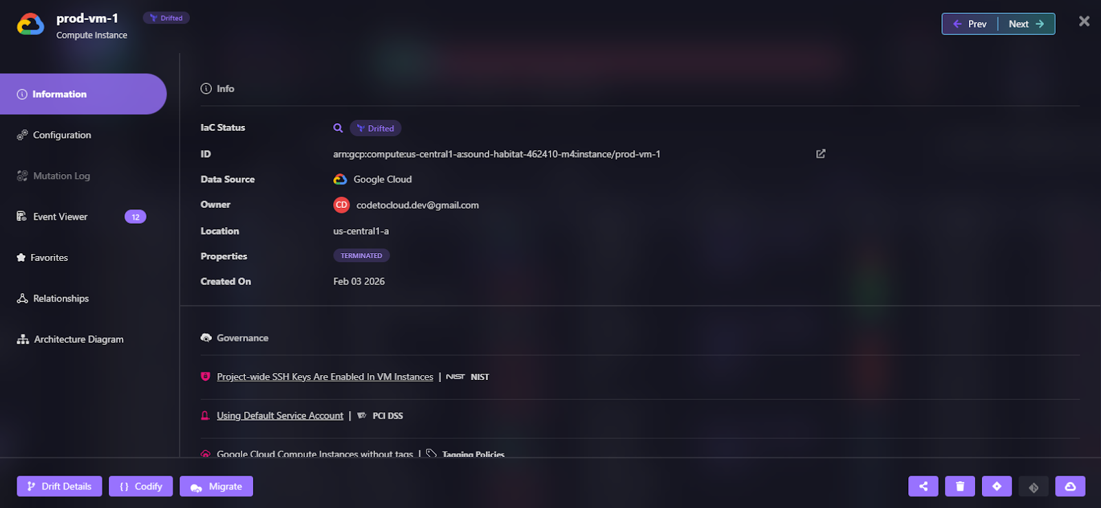 - If production drifted, Firefly shows you exactly where, as shown in the snapshot below, where a GCP Compute Engine instance (prod-vm-1) has drifted from its IaC definition: