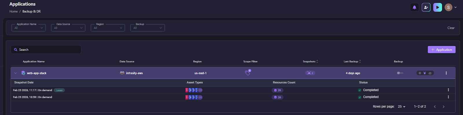 Each snapshot is timestamped and tied to a specific application, so teams always have a clear, reliable starting point for recovery.