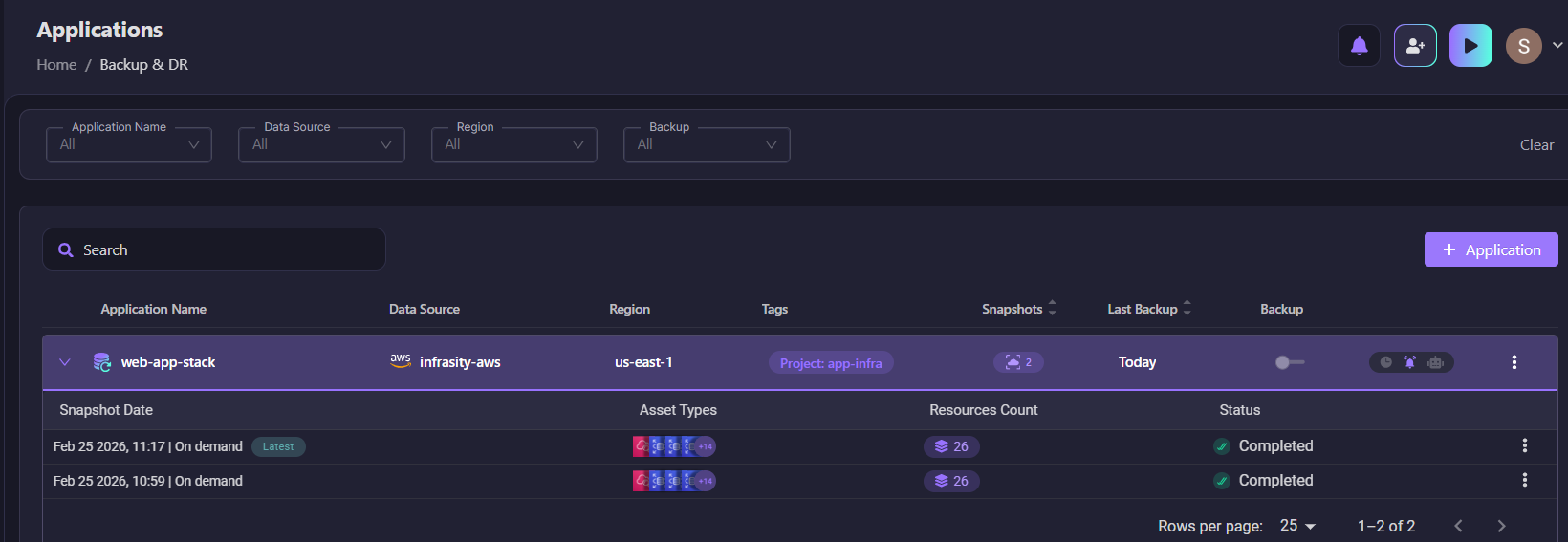 The Applications dashboard shows all protected applications with their backup status. The web-app-stack application is configured with data source infrasity-aws, region us-east-1, and tagged with Project: app-infra. It has 2 snapshots captured with the last backup completed today.