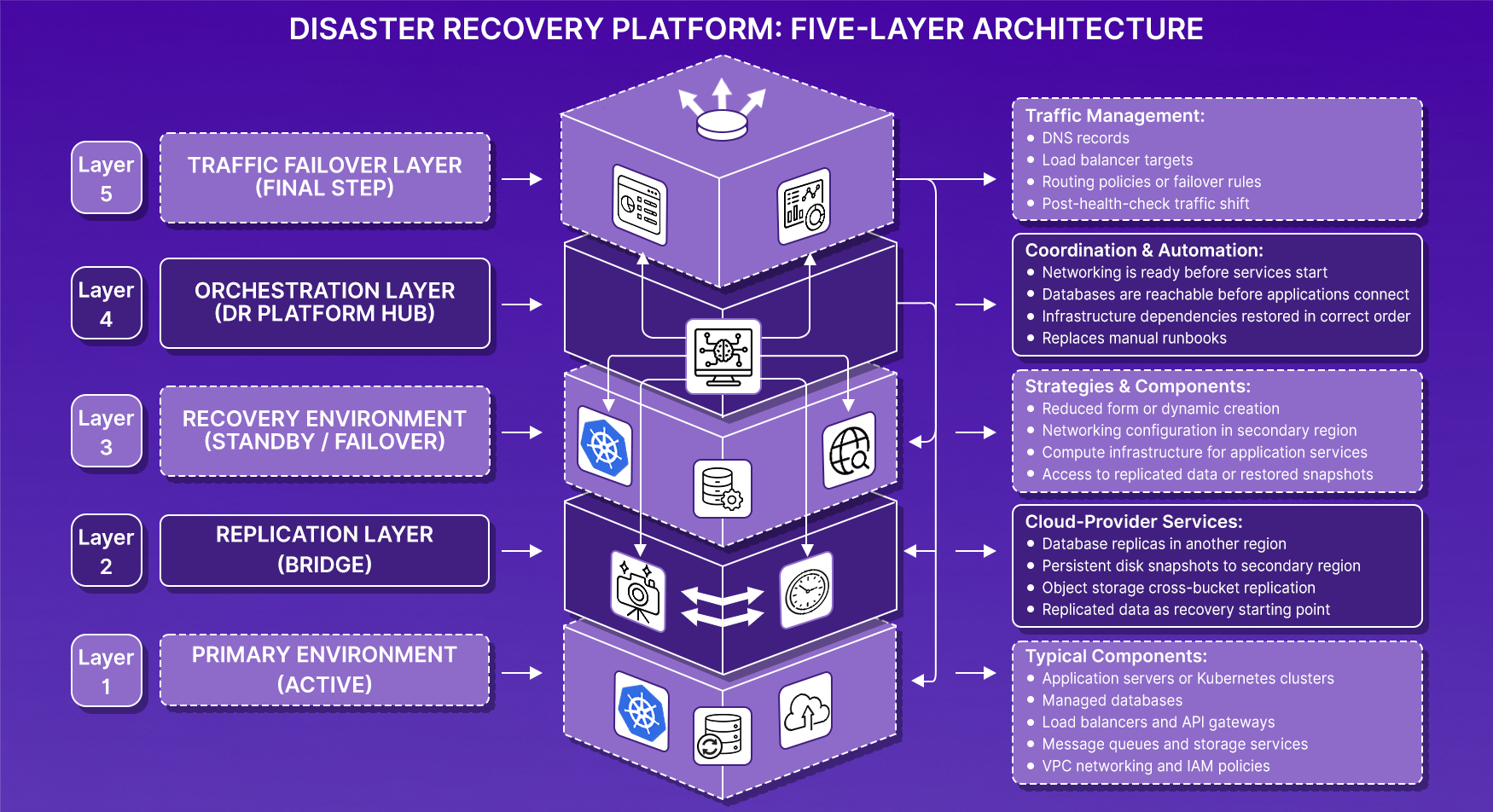 In most cloud environments, disaster recovery is built as a layered architecture. Each layer handles a different part of the recovery process.