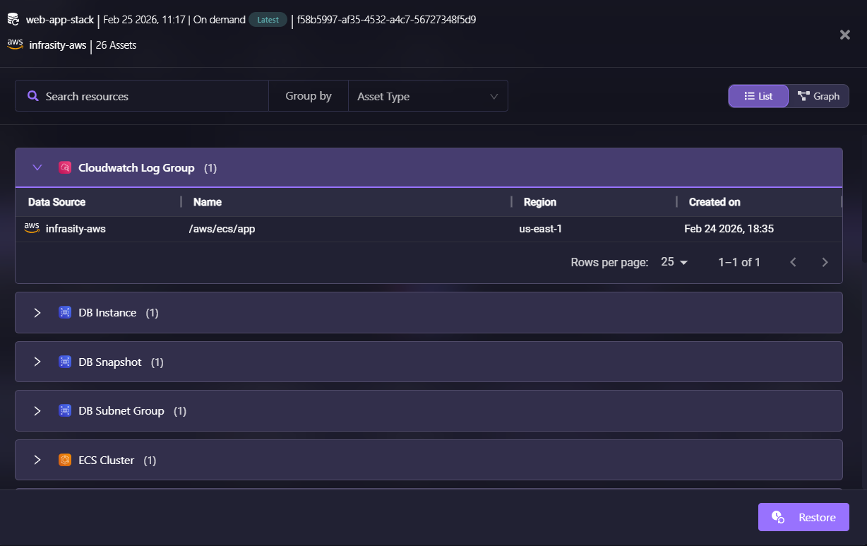 The snapshot detail view groups resources by type: CloudWatch Log Group, DB Instance, DB Snapshot, DB Subnet Group, ECS components, networking resources, and IAM roles. This makes it easy to verify that all necessary infrastructure components are captured.