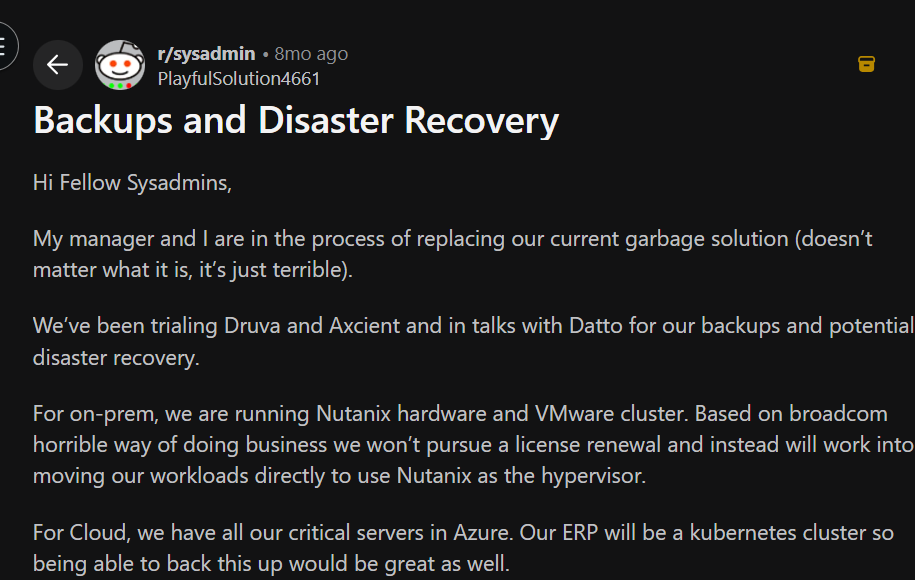 The Sysadmin's checklist covers: automated restore testing, integrity checks, native Nutanix VM backup and restore, the ability to restore into Azure and fall back to on-prem, DRaaS options, no hardware appliances, and lower cost. They trialed several vendors, and each one was missing something important.