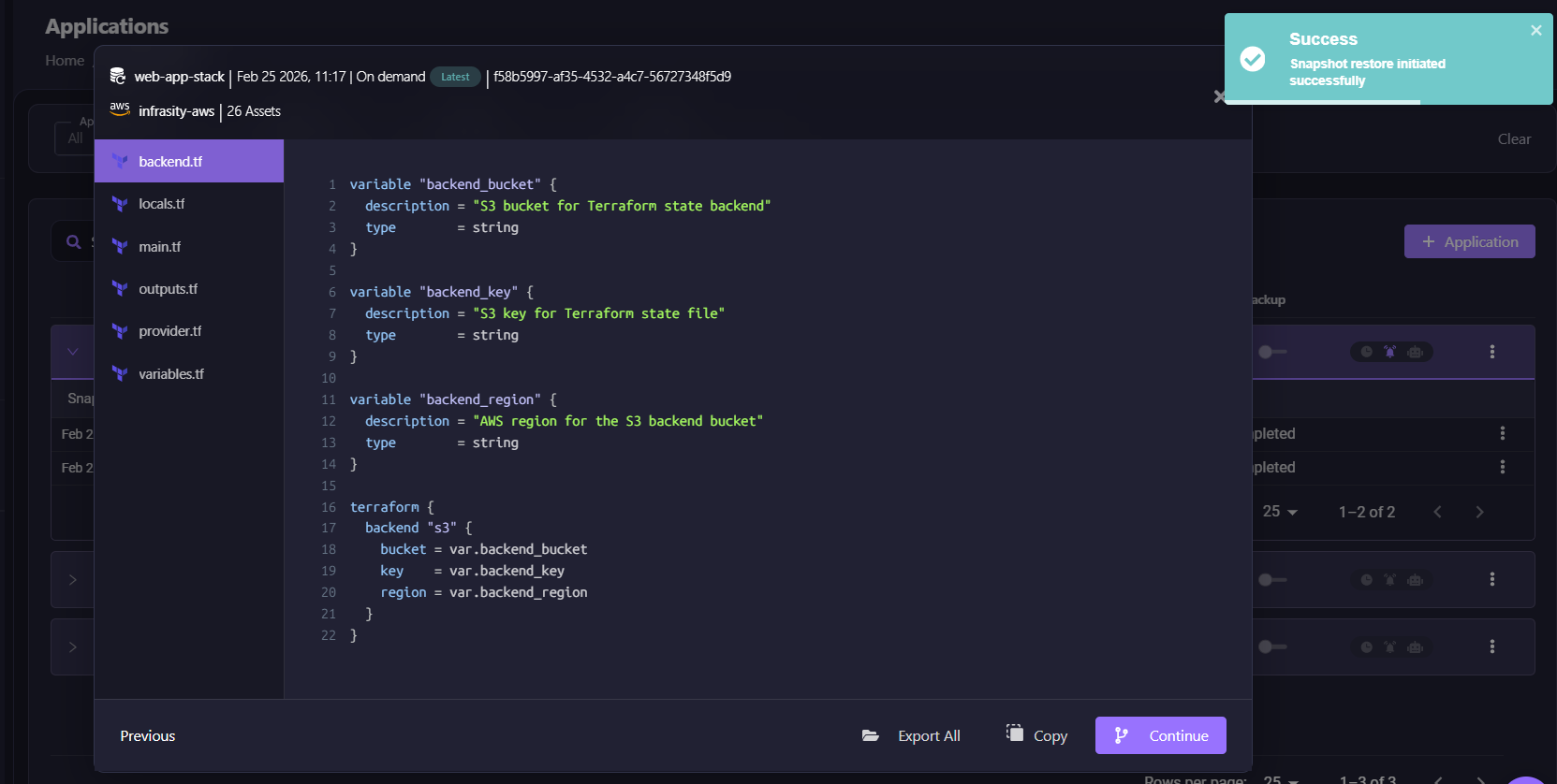 When initiating a restore, Firefly generates deployment-ready Terraform code from the captured snapshot. The interface shows the generated files: backend.tf, locals.tf, main.tf, outputs.tf, provider.tf, and variables.tf. The code includes complete infrastructure definitions with S3 backend configuration, variable references, and resource declarations. Teams can export all files, copy the code, or continue with the automated restoration workflow.