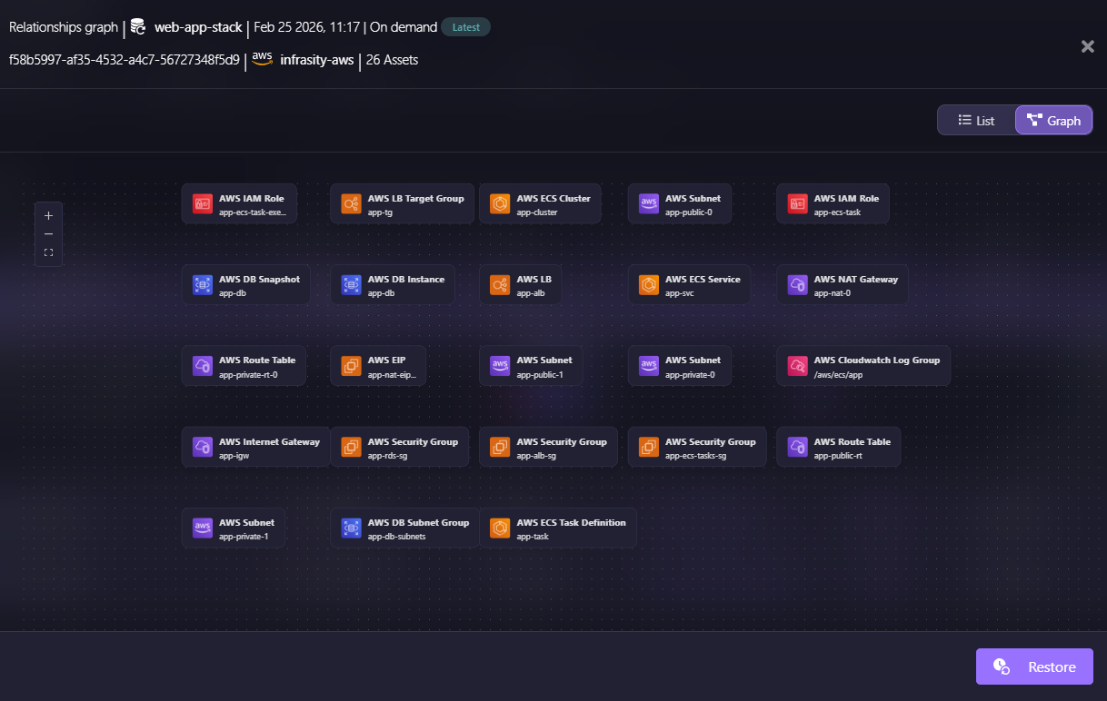 This relationship graph visualizes the 26 assets captured in the snapshot. The graph includes the ECS cluster, load balancer, database instance, NAT gateway, security groups, subnets, IAM roles, and CloudWatch log groups, all automatically detected through relationship scanning.
