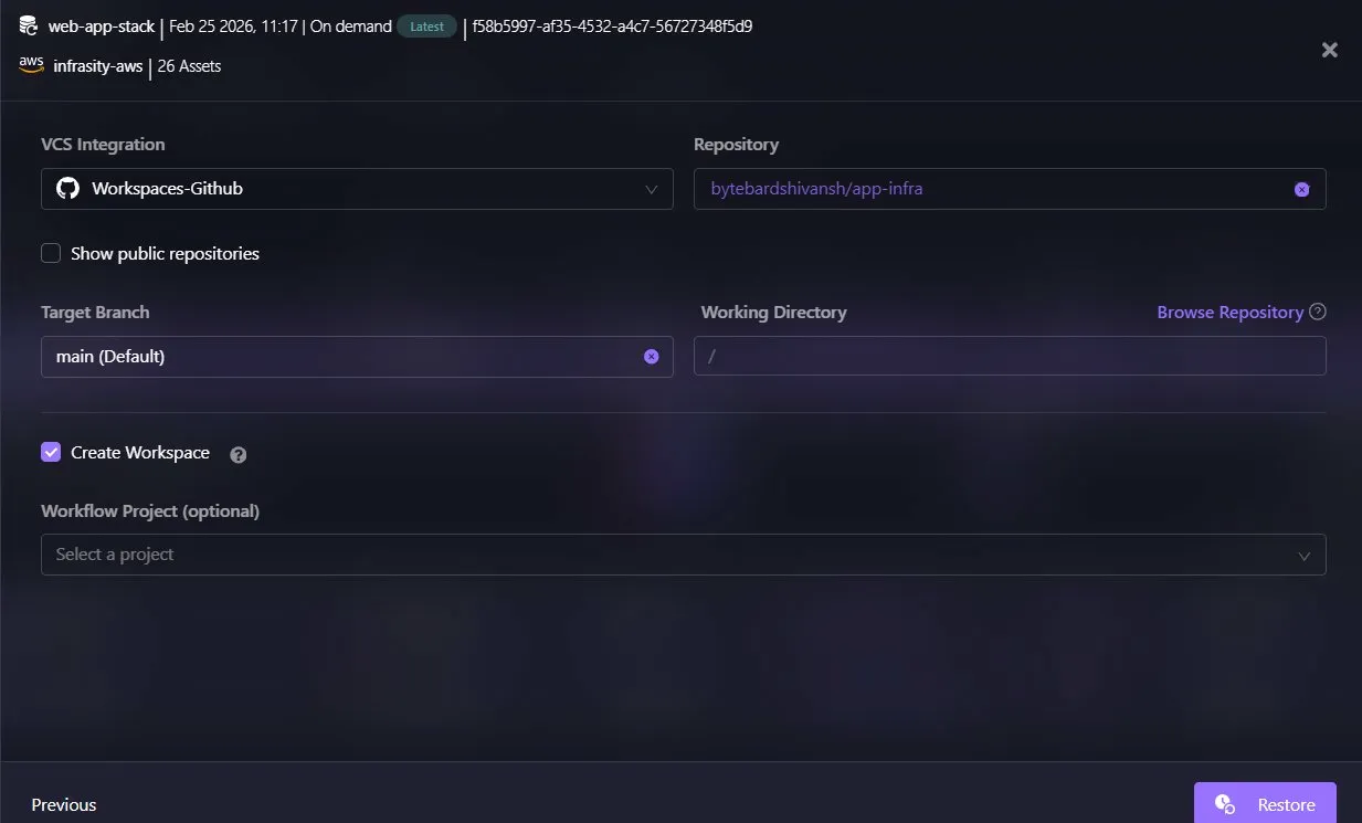 Firefly integrates with version control systems to support GitOps workflows. The restore configuration connects to GitHub (Workspaces-Github), targets the repository (bytebardshivansh/app-infra), and can create pull requests to the main branch. This allows the generated Terraform code to be committed to version control, reviewed via pull request, and deployed through existing CI/CD pipelines, ensuring recovery follows the same operational model as normal infrastructure changes.