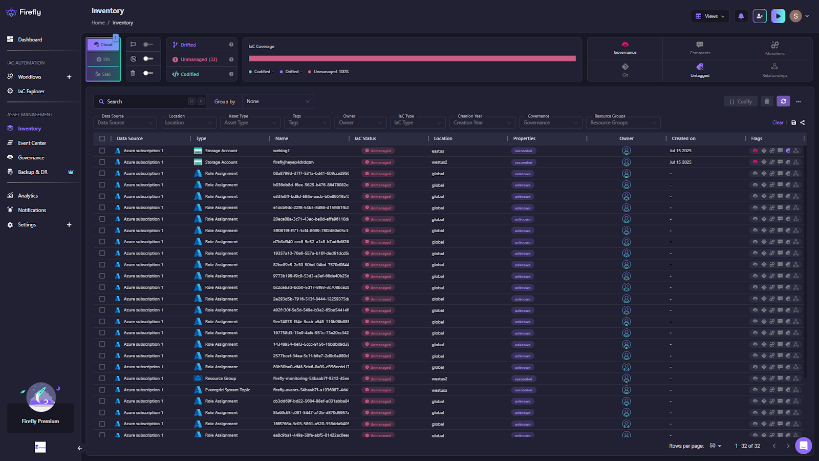 - Inventory with IaC awareness: Every resource is labeled as Codified, Drifted, Unmanaged, or Ghost. You can filter by provider, type, owner, or tag to target cleanup.