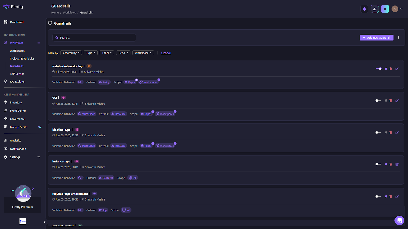 The Guardrails dashboard, as in the snapshot below, provides a central view of all active rules, showing their type (Policy, Cost, Resource, or Tag), defined criteria, scope across repositories, workspaces, branches, or labels, and the configured violation behavior (Strict or Flexible Block).Â