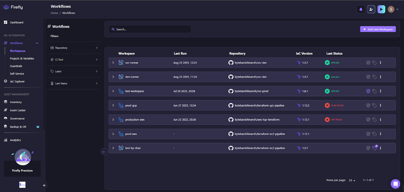 The workspace list view displays multiple workspaces connected to repositories and specific IaC versions, with clear status indicators showing whether the most recent plan or apply succeeded or failed. It also includes search and filter options, allowing engineers to quickly organize workspaces by repository, CI tool, or labels for easier navigation and management.