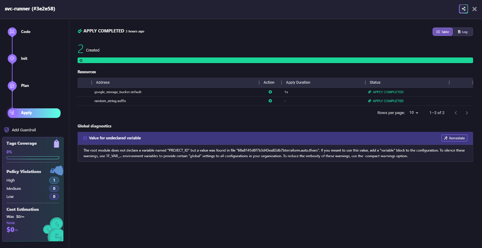 The run output view shows the full execution flow across stages, Code, Init, Plan, and Apply, along with details of the resources created, such as a GCP storage bucket. It also provides diagnostics by flagging issues like undeclared variables and suggesting remediation steps. In addition, it surfaces cost estimates and policy compliance status inline, giving engineers visibility into both financial and governance impacts during execution.