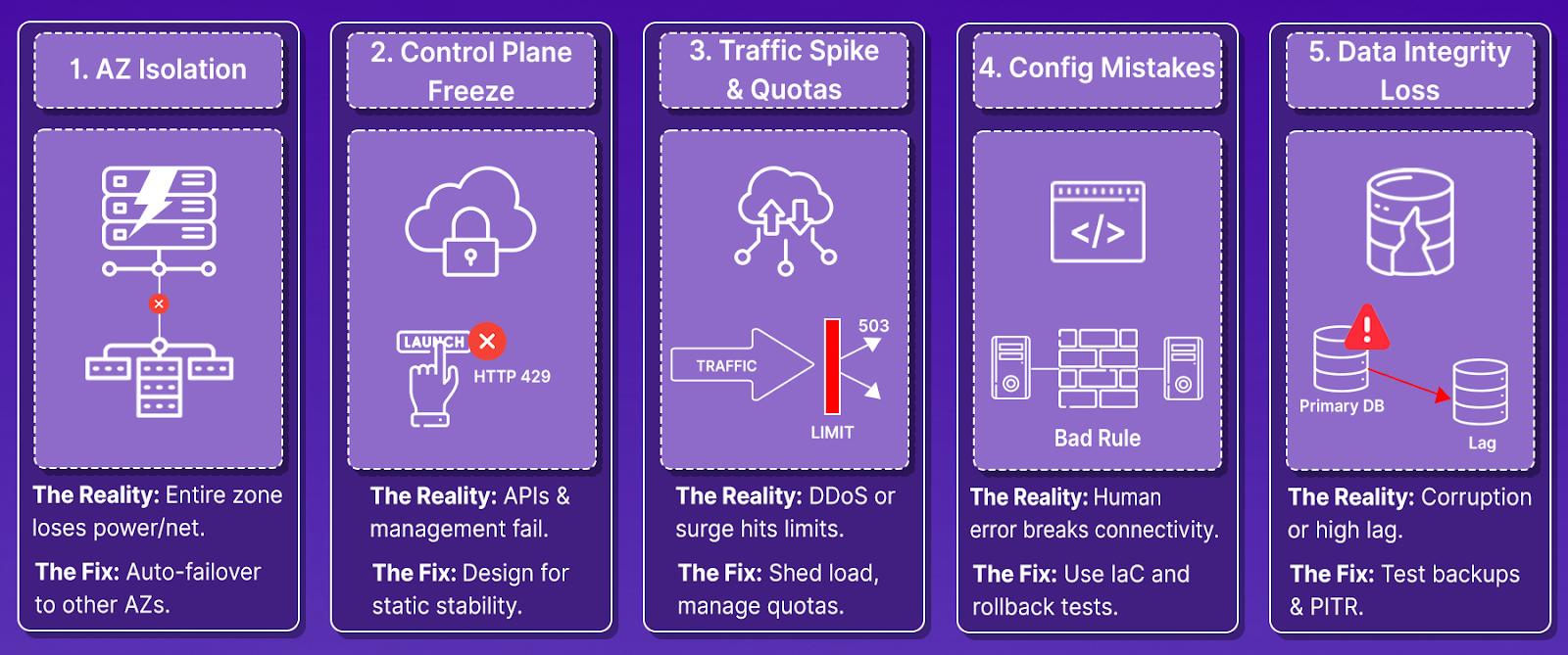 Instead of abstract "high availability," your architecture should explicitly handle these real scenarios: