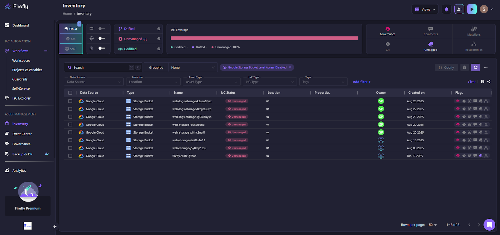 This turns Firefly into more than just a compliance engine; it acts like a Cloud Security Posture Management (CSPM) solution, continuously monitoring resources at a granular level while connecting policy violations back to ownership and IaC coverage.