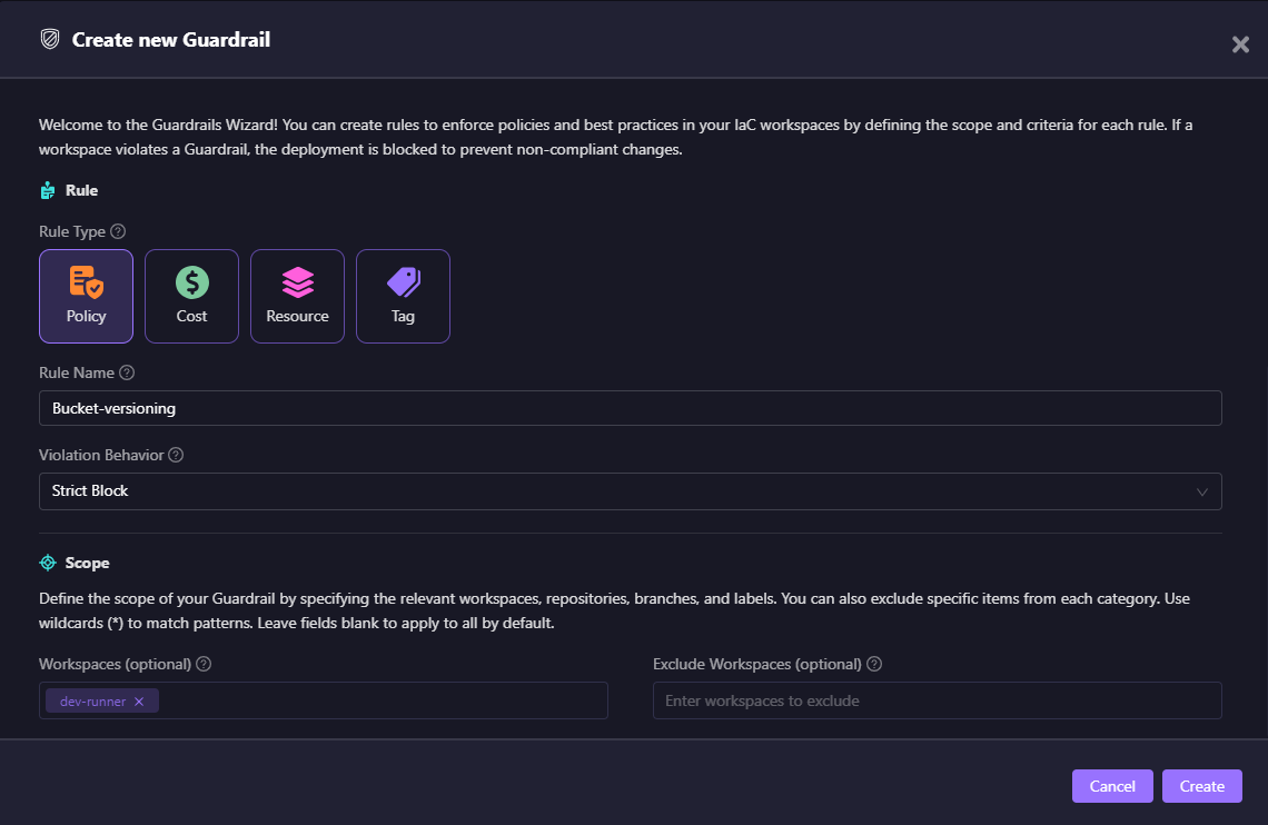 For example, in the screenshot above, a web-bucket-versioning guardrail enforces that all S3 buckets in a target workspace have versioning enabled. If this condition is not met, the deployment is blocked before any non-compliant resource hits production.
