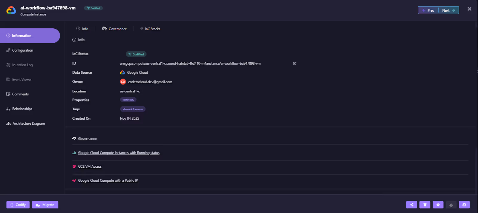 - Deep Resource Context and Governance Insights: Clicking into an individual resource (such as a GCP compute instance) reveals its complete IaC lineage, owner, and associated governance policies. This helps teams instantly trace configuration sources, detect drift, and apply AI-driven remediation.