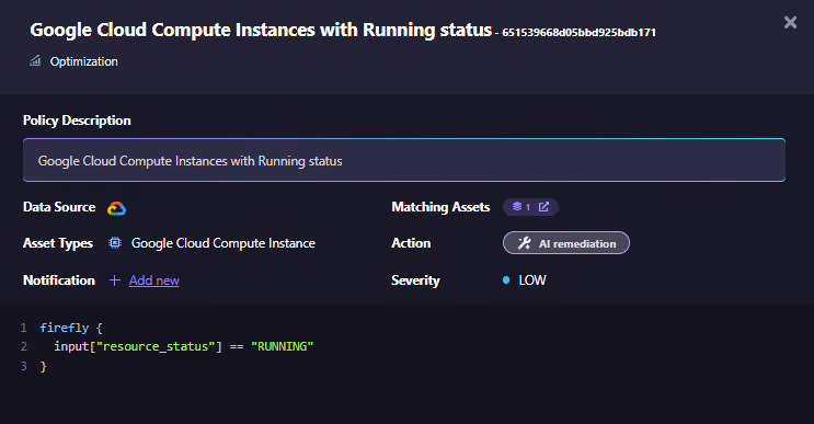 This example demonstrates a Firefly’s optimization policy that identifies and remediates Google Cloud instances left in an unnecessary running state, directly tied to AI infrastructure optimization.