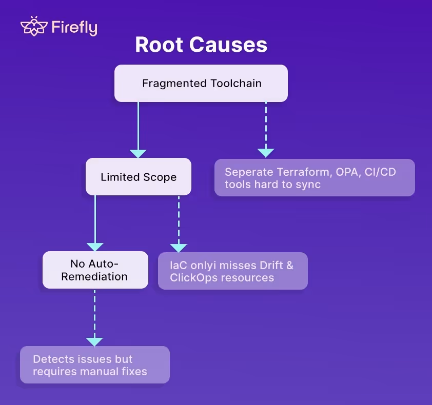 Even if everything starts perfectly from IaC, configuration drift is inevitable. A developer logs in to quickly fix a production issue, changes a setting, and now the live cloud environment no longer matches the defined state in the Terraform code. This leads directly to policy drift and non-compliance.
