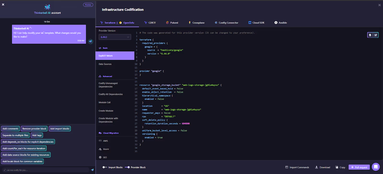 On codifying this resource, Firefly generates a PR ready Terraform that can then be applied directly to provision the infrastructure, making it reusable and version-controlled. Here's how the scanned Google Cloud Storage Bucket config is auto-generated: