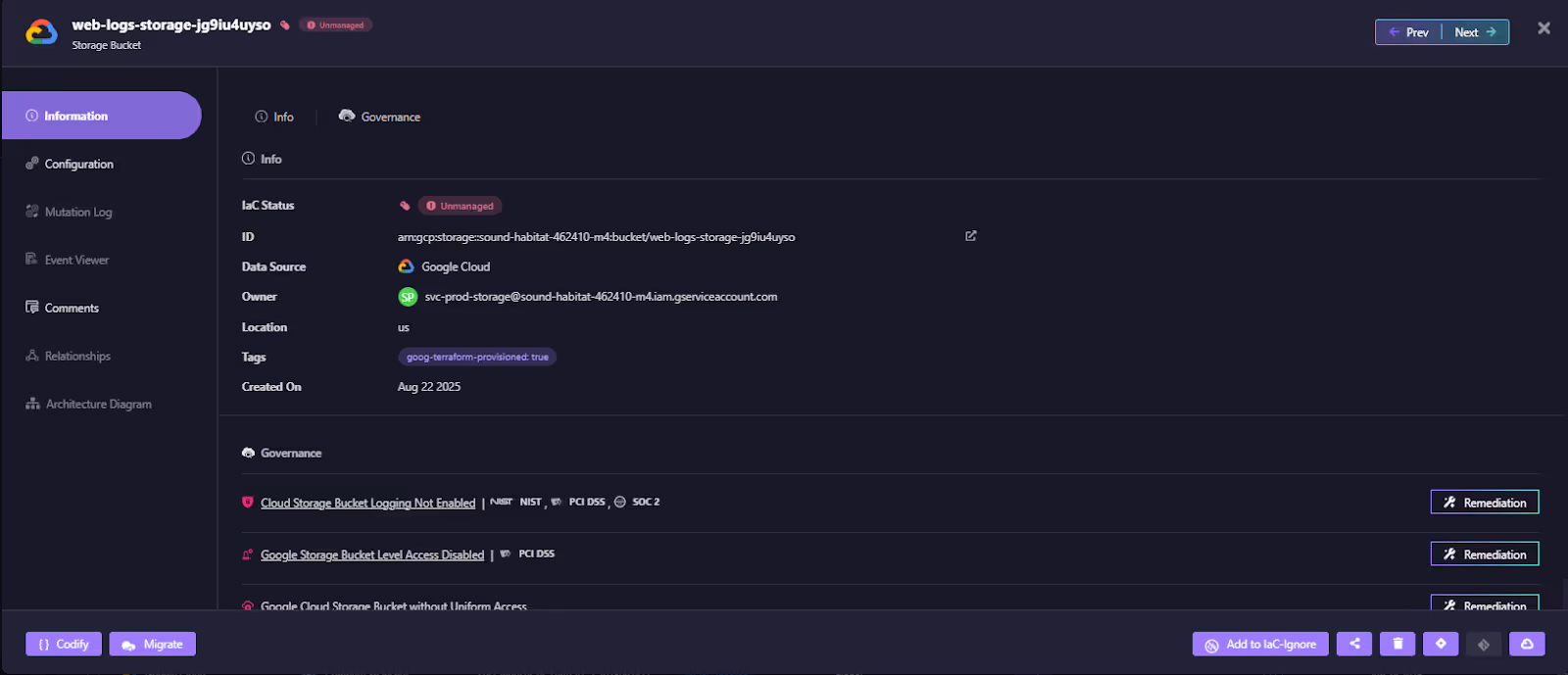 The above snapshot highlights non-compliant resources, such as Google Cloud Storage Buckets, that are not encrypted or are missing required tags. The continuous monitoring and automated remediation reduce the burden on governance teams, ensuring resources remain compliant with organizational and regulatory policies.