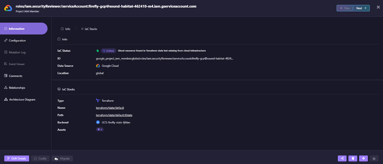For example, here is marked with a drift status, indicating that a change has been detected between the infrastructure code and the actual deployed configuration: