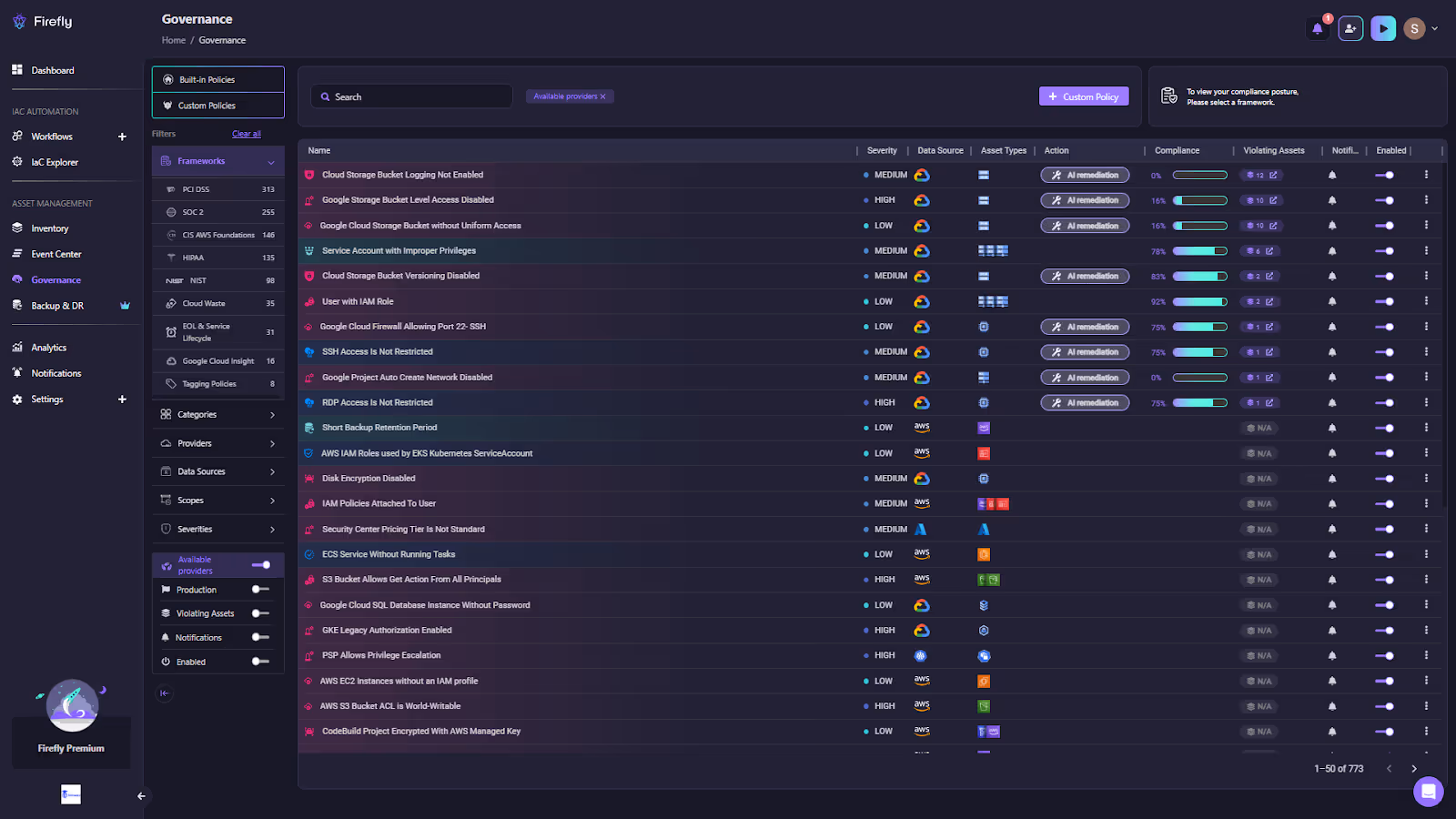 With Firefly: Firefly uses Open Policy Agent (OPA) to enforce governance as code across all connected environments. Hereâs the OPA-based governance dashboard of Firefly: