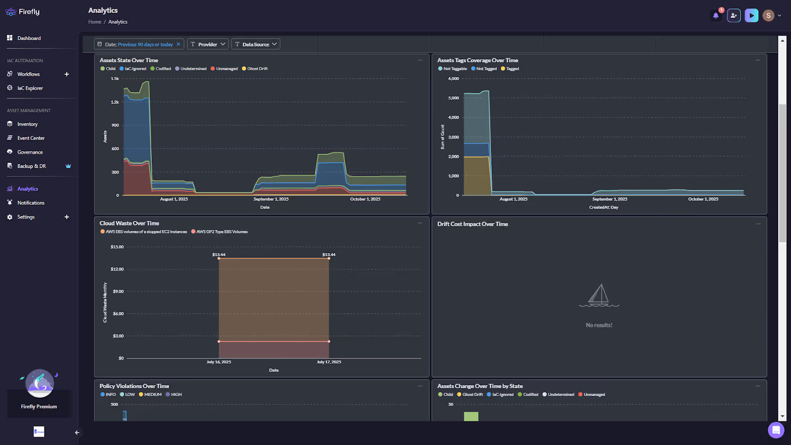 With Firefly: Firefly provides real-time cost visibility for every discovered resource, enriched with metadata like owner, project, and tag. It highlights unused or underutilized resources and quantifies potential savings from right-sizing or shutdown. As shown in the Fireflyâs analytics page below, Firefly highlights potential cost savings and waste from unused resources, such as unoptimized VMs or storage buckets: