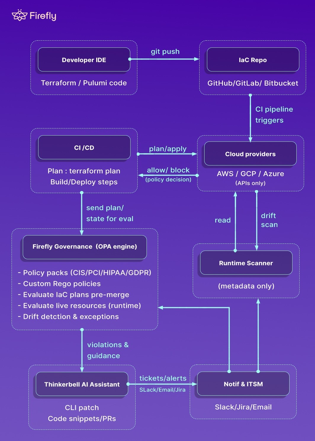 Because Firefly evaluates both IaC plans and live resources, it closes the gap between what’s in code and what’s actually deployed. The diagram illustrates how Firefly integrates with developer IDEs, IaC repos, CI/CD pipelines, and cloud provider APIs. Policies are evaluated before deployment and at runtime, with violations surfaced through notifications and automated fixes: