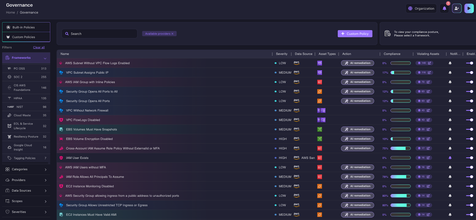 - Cloud providers: AWS, Azure, GCP with multi-account and multi-region support