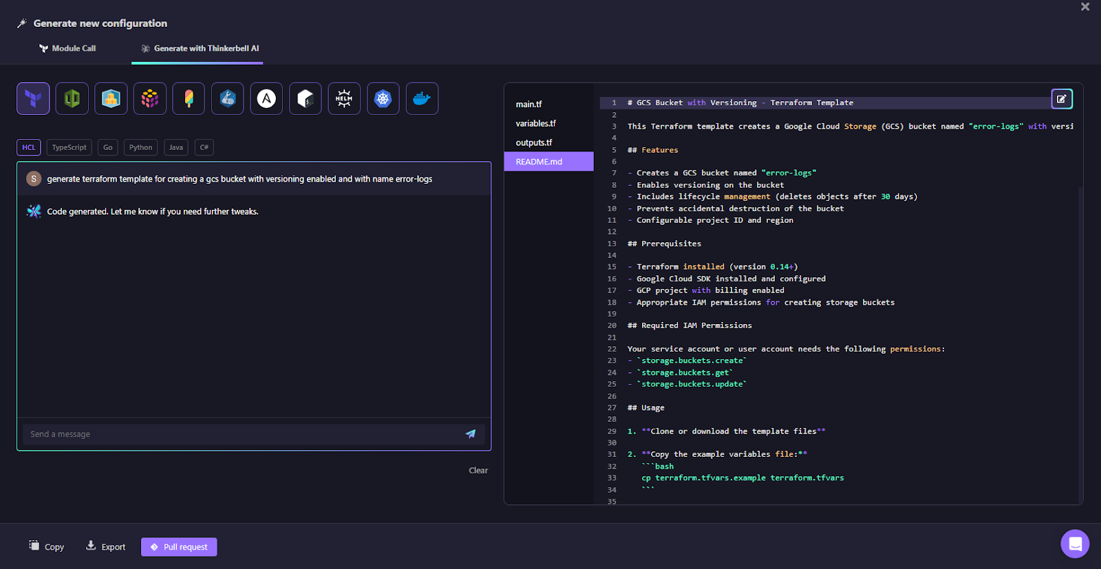 - Generate with Thinkerbell AI: This feature enables users to generate custom Terraform code by simply describing the desired infrastructure in plain English.