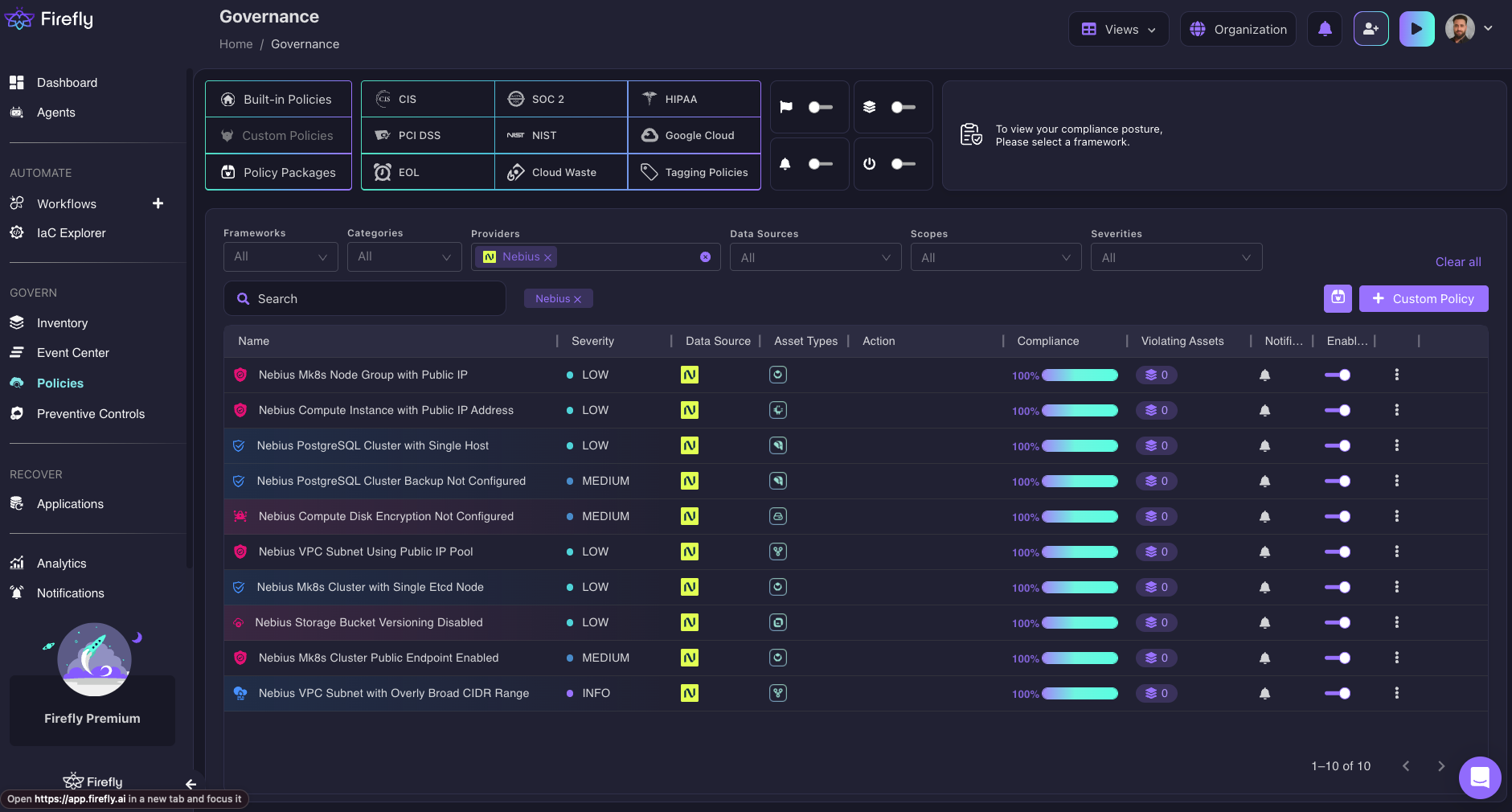 With 600+ built-in compliance and security policies, covering SOC 2, PCI DSS, HIPAA, ISO 27001, NIST, and DORA, Firefly ensures your Nebius environments remain audit-ready at all times. Teams can enforce tagging standards, cost controls, end-of-life policies, and custom governance rules across every resource, and automatically remediate violations before they escalate into downtime or security risks.