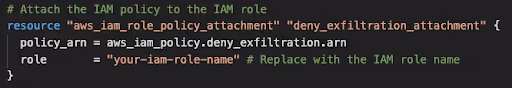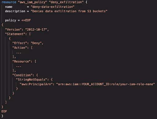 For instance, if we detect a malware outbreak, the initial step would be to block our services in order to safeguard our data. To accomplish this, we can create a dedicated IAM Policy with explicitly denied permissions for S3, DynamoDB, and RDS. This policy can be easily modified using a dedicated variable, allowing for a quick change in your aws incident response playbook.