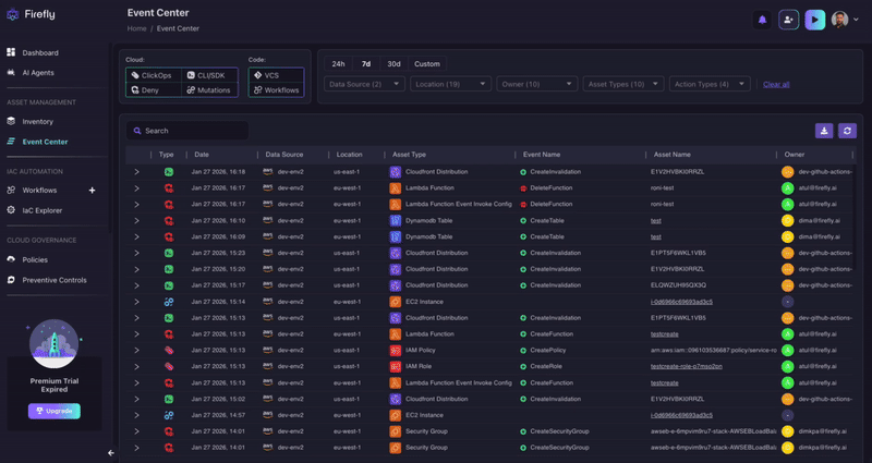This is exactly what Firefly's Event Center was built for. It aggregates cloud events (including ClickOps changes, CLI operations, IaC-driven changes, and critically, Deny events) into a single, filterable view across all your connected accounts. We can filter by: