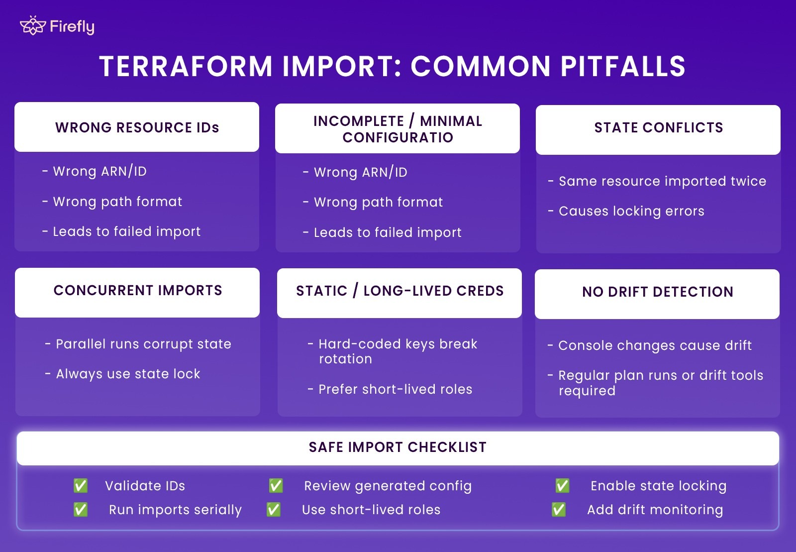 - State Conflicts: Importing the same resource into multiple states or addresses creates immediate conflict errors. Remote backends with locking prevent these collisions.