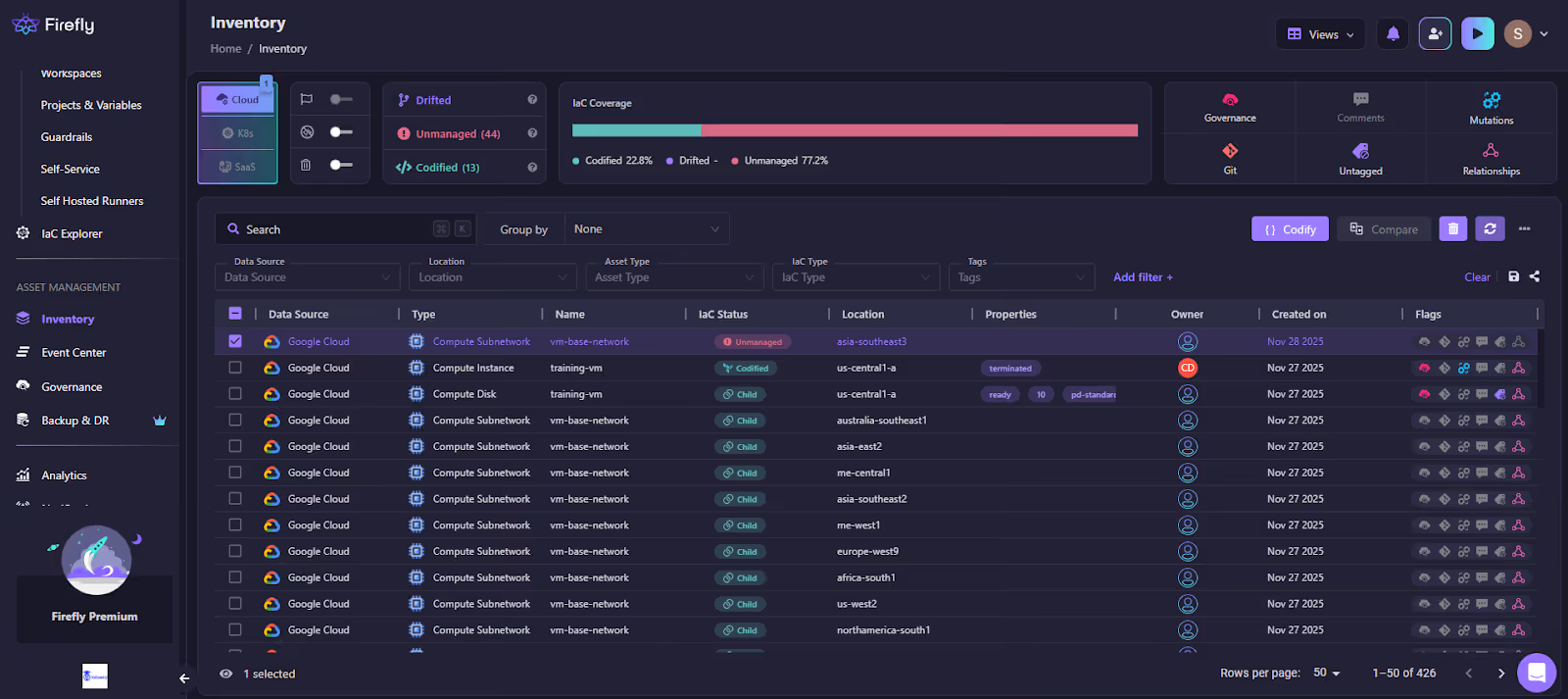 Firefly builds an inventory by querying AWS, Azure, and GCP APIs directly. Every resource is automatically classified as: