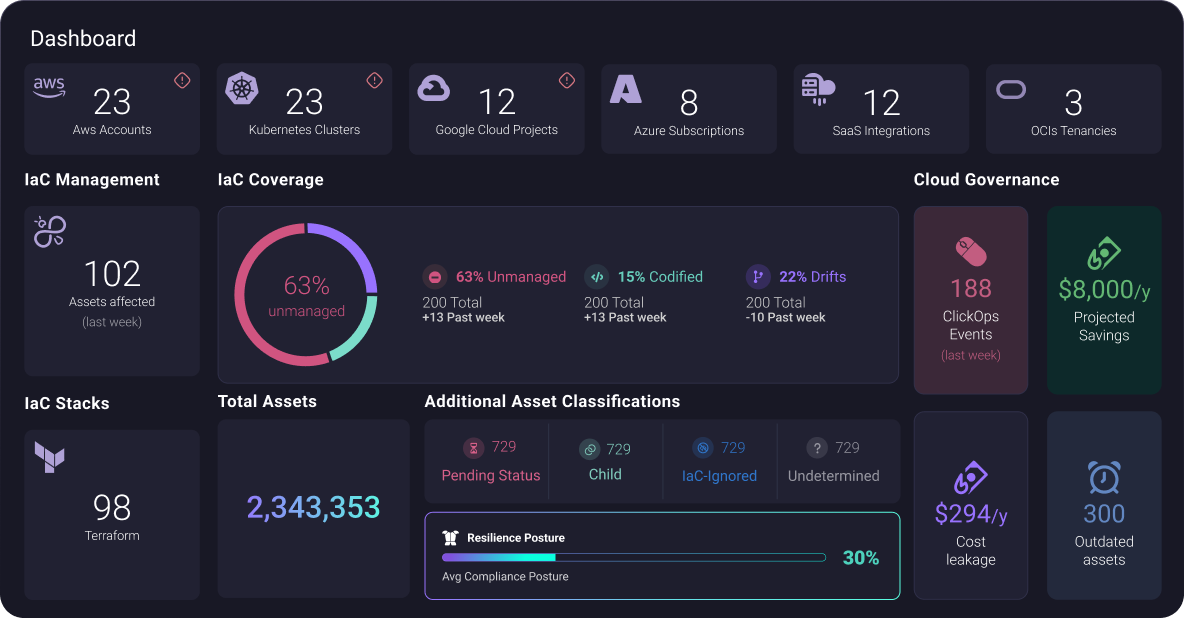 Firefly connects with your entire cloud ecosystem—multi-cloud, Kubernetes, SaaS applications, and source control—unifying everything that can be managed as code. With deep, out-of-the-box integrations, Firefly brings full visibility, automation, and governance to your infrastructure, ensuring every asset is tracked, optimized, and secure from day one.