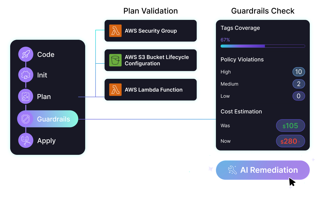 Firefly standardizes your entire infrastructure delivery through GitOps workflows with built-in guardrails that validate every deployment before it reaches production. Enable teams to provision infrastructure on demand using reusable blueprints, without writing code, while maintaining full governance through customizable approval workflows. Supports Terraform, OpenTofu, Pulumi, CloudFormation, and Crossplane.