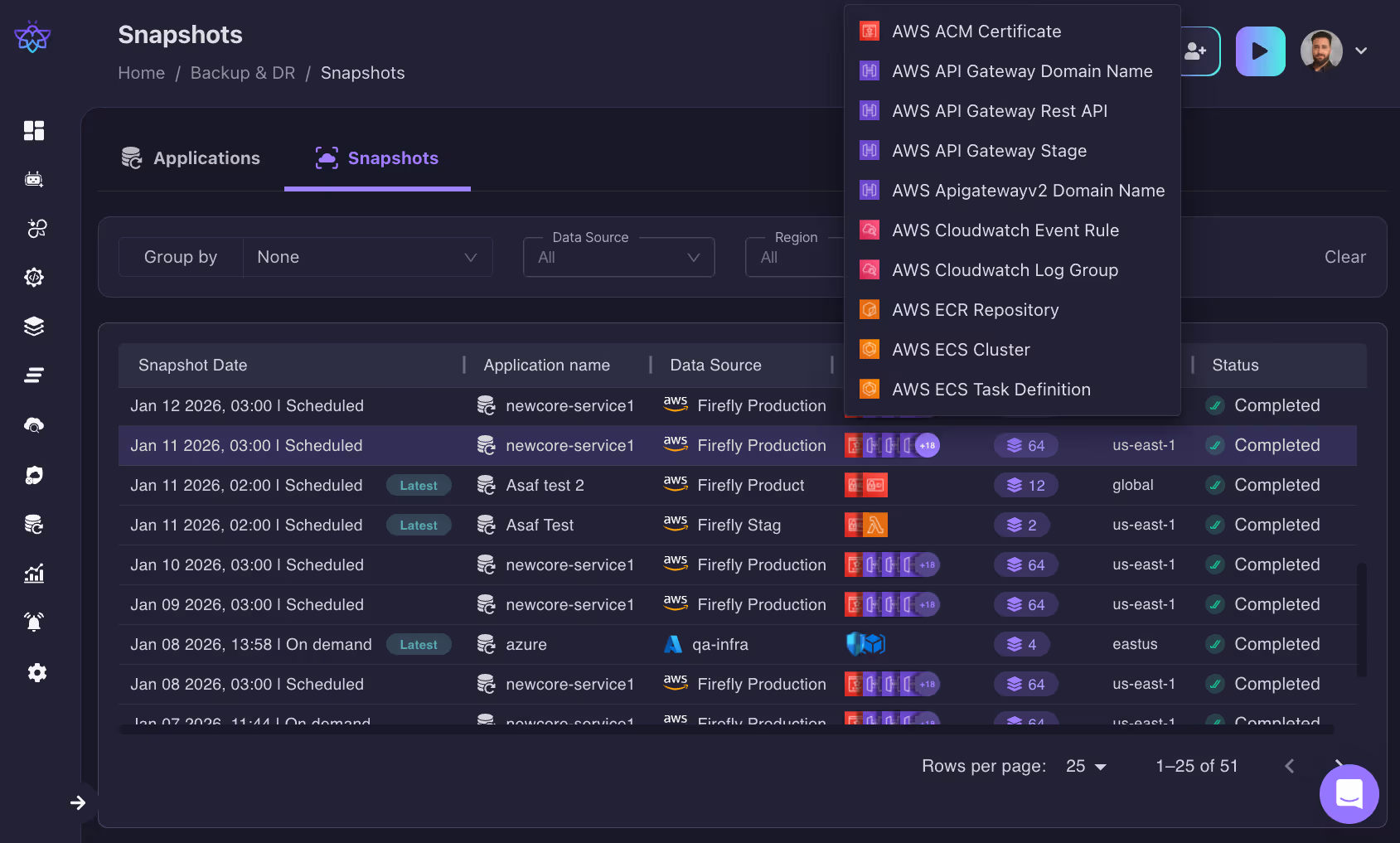 Firefly continuously snapshots your cloud infrastructure across clouds, regions, accounts, Kubernetes, and SaaS. Snapshots are stored as deployment-ready Infrastructure-as-Code, so recovery is always current and provider-independent.