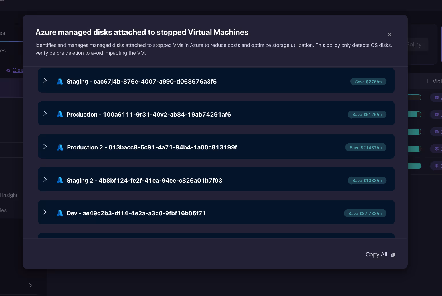 Firefly scans your cloud environment to identify unused and idle resources, such as unattached volumes, unused IP addresses, and stopped instances. It provides actionable remediation suggestions to enhance operational efficiency, eliminate cloud waste, and reduce costs.